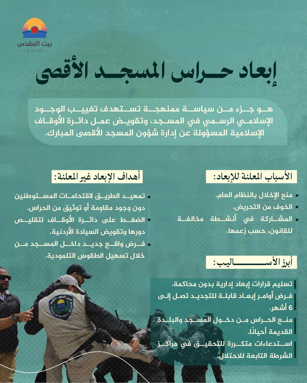 سلمت مخابرات الاحتلال الإسرائيلي، اليوم الإثنين، قرارًا بالإبعاد عن المسجد الأقصى لمدة أسبوع لحارسين من حراس المسجد، في تصعيد جديد ضمن سياسة التضييق على موظفي الأوقاف الإسلامية في القدس المحتلة.