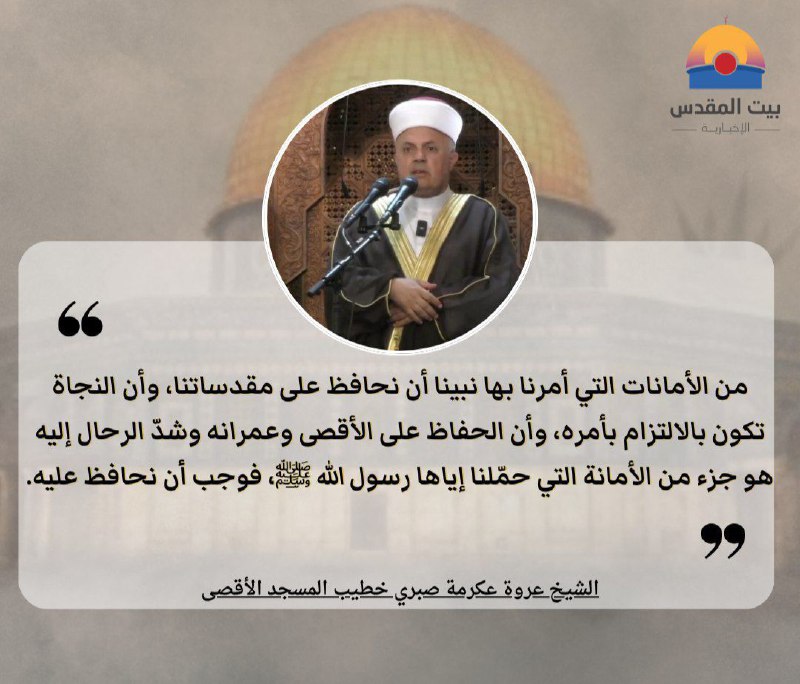 “من الأمانات التي أمرنا بحفظها مقدساتنا ومساجدنا، ومنها المسجد الأقصى المبارك، فهو أمانة الرسول صلى الله عليه وسلم.”